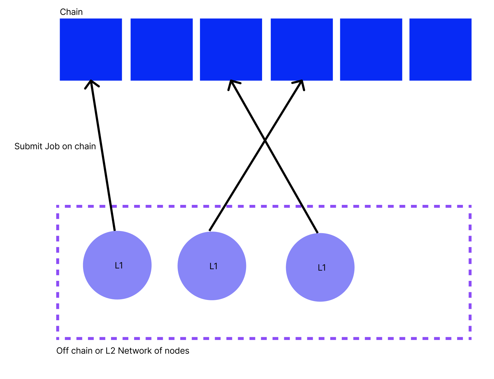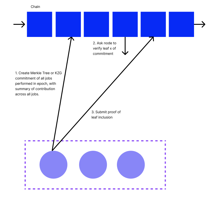 Another improvement to the naive solution is for each node in the network to record their jobs and then submit on chain a summary of their jobs over each epoch, along with a commitment that the jobs were performed correctly. This approach moves the needle on two of the three criteria: scalability, privacy.