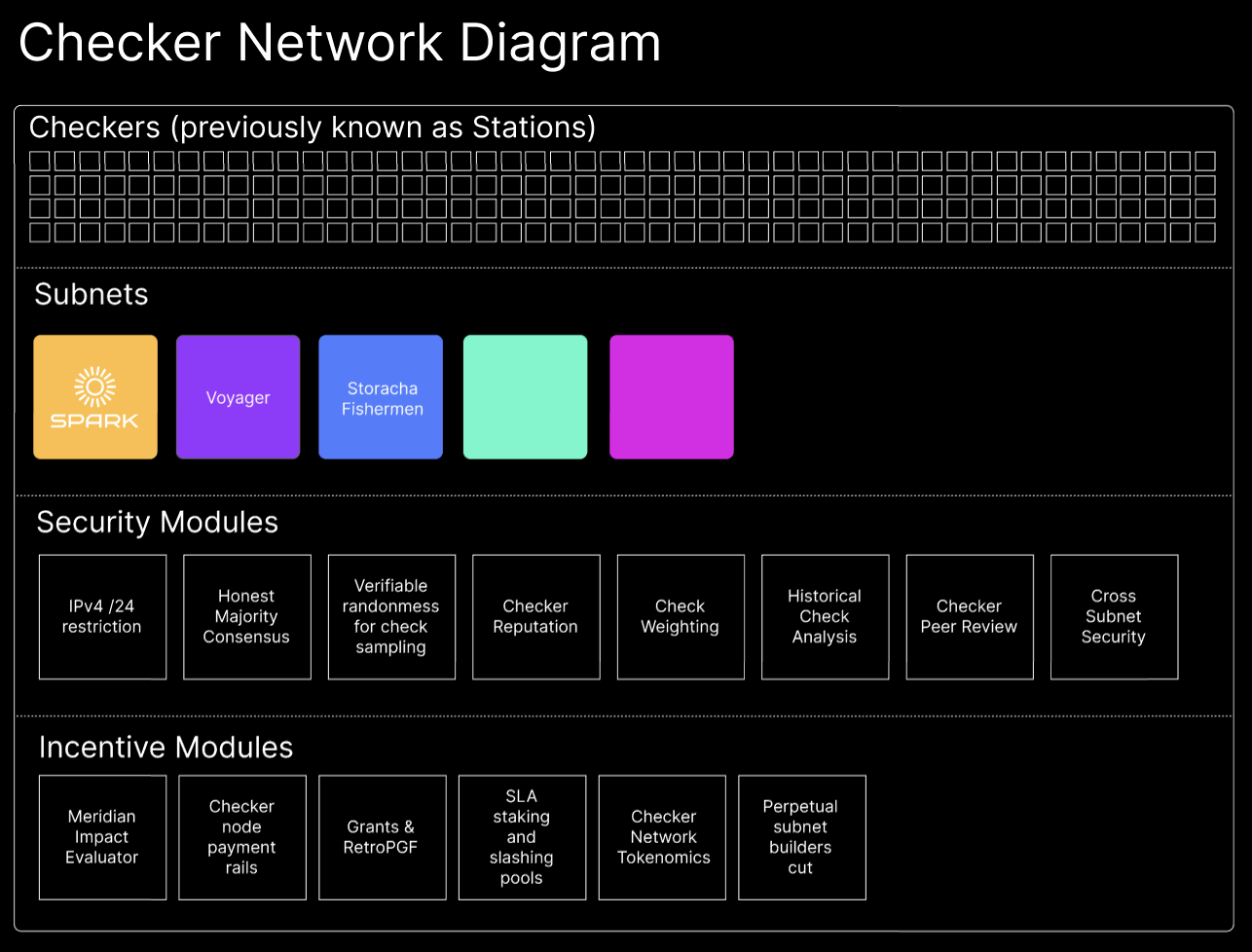 Filecoin Spark will now be the first subnet of the Checker Network, which will act as an umbrella network for checker subnets like Filecoin Spark, offering security module and payment rails to each subnet.