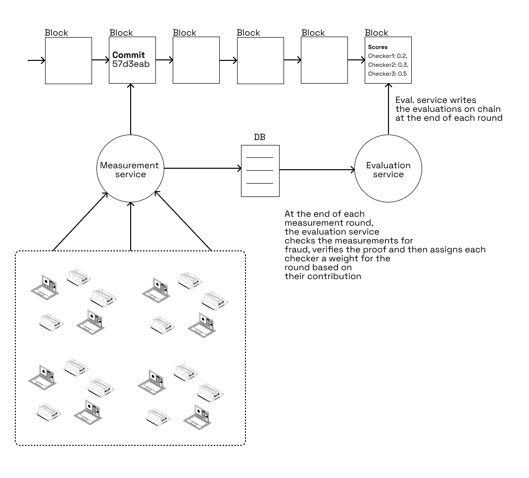 At the end of each measurement round of Spark, the evaluation service begins its work. It checks the proof of data possession in each measurement, and runs other fraud detection checks. It then aggregates the contribution of each Spark checker in the round into a score. It then submits a score for each checker on chain.